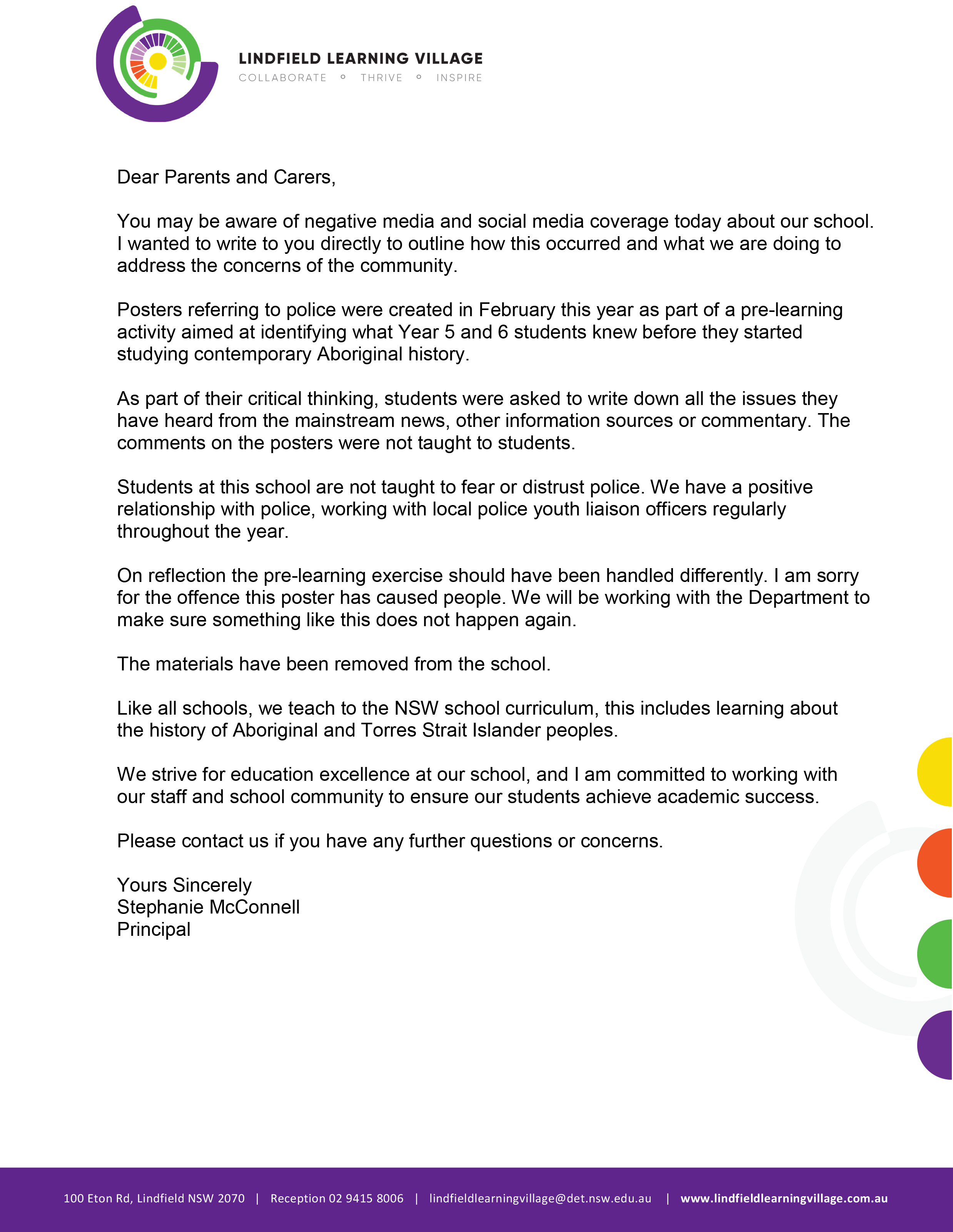 Full statement from Lindfield Learning Village (click to enlarge)