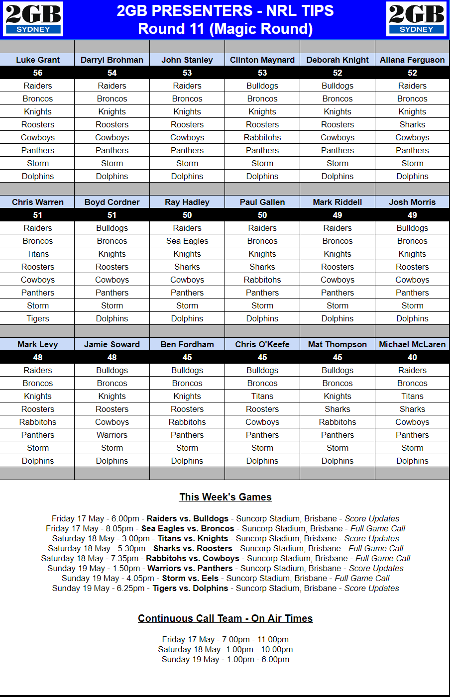 REMINDER: In 2024, Continuous Call Team listeners are encouraged to enter the official NRL Tipping Competition. Please note – this is an external competition, with management, prizing and terms & conditions administered by the National Rugby League.