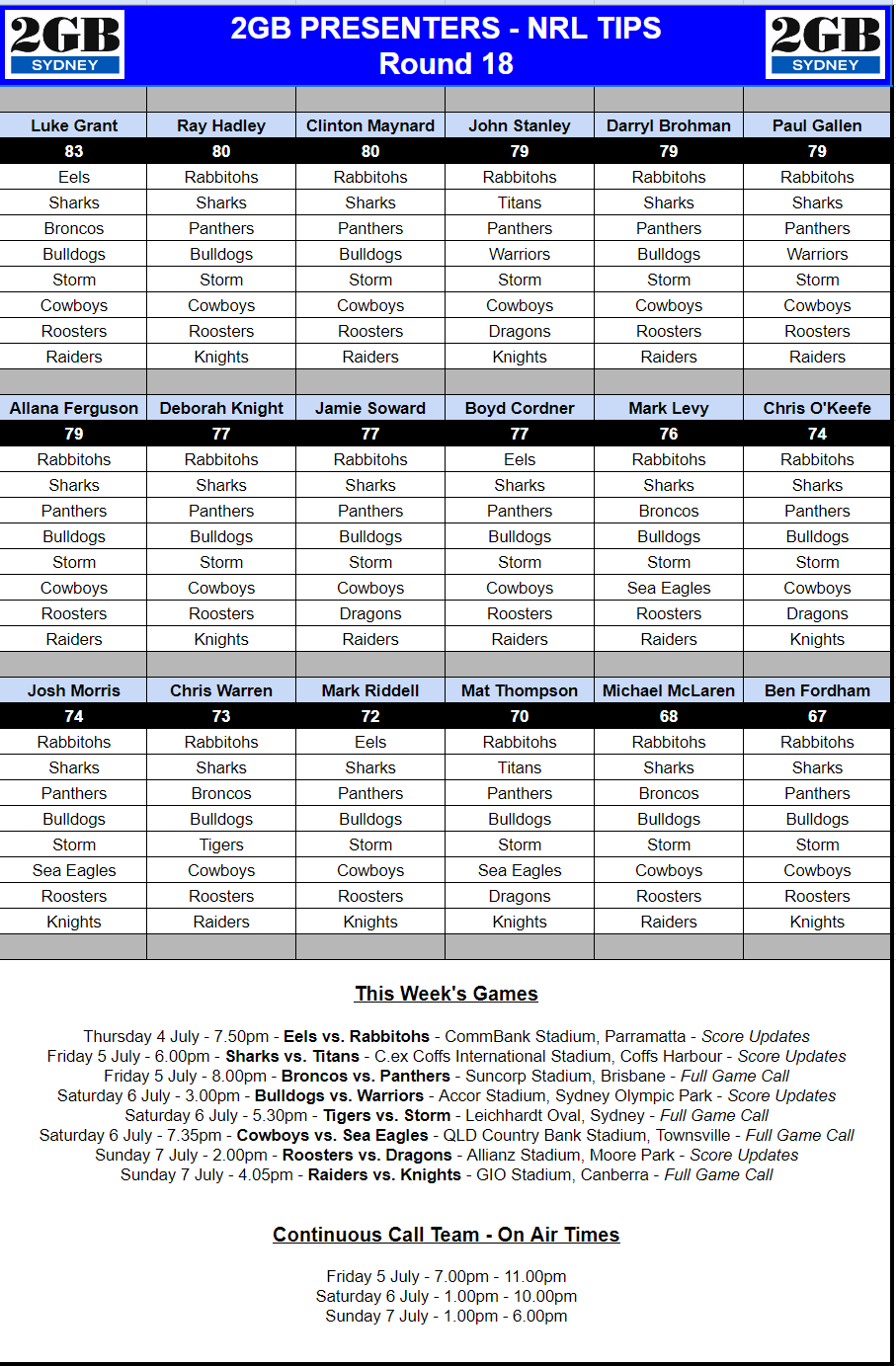 REMINDER: In 2024, Continuous Call Team listeners are encouraged to enter the official NRL Tipping Competition. Please note – this is an external competition, with management, prizing and terms & conditions administered by the National Rugby League.
