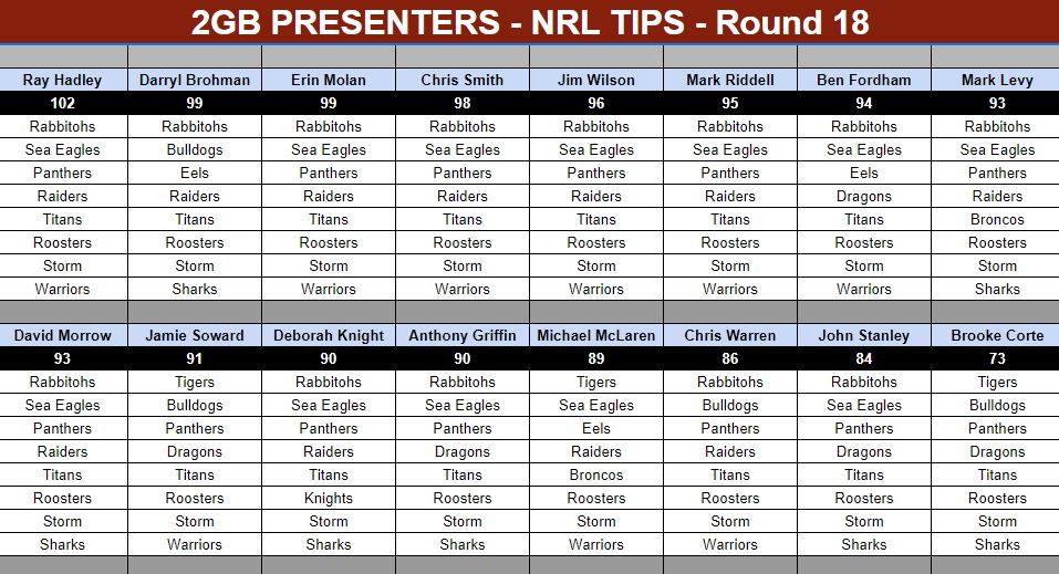 Each week, Ray Hadley, Ben Fordham, CCT members and the rest of our presenters will reveal their tips right here before the round gets underway.