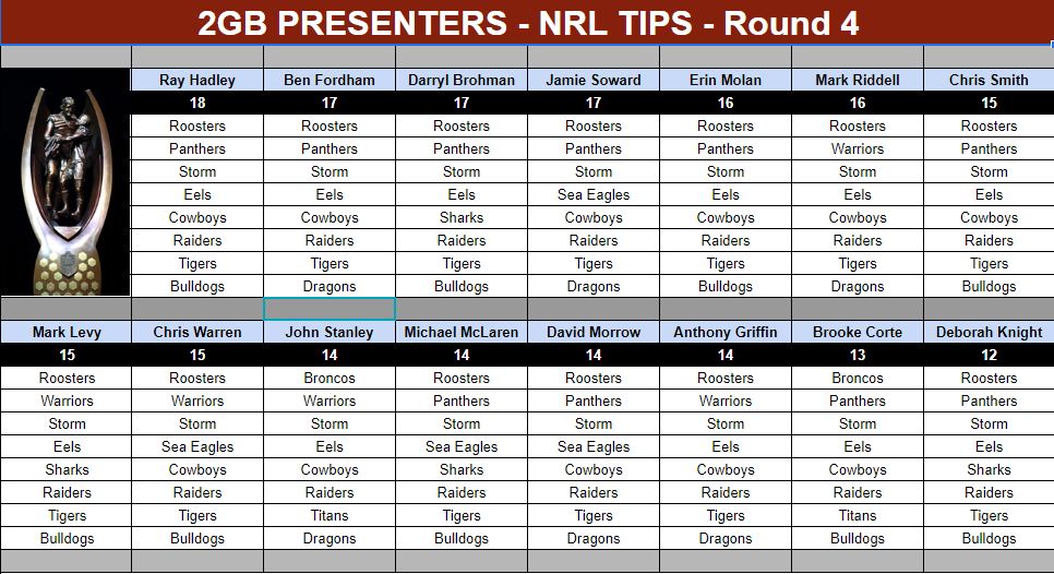 Each week, Ray Hadley, Ben Fordham, CCT members and the rest of our presenters will reveal their tips right here before the round gets underway.