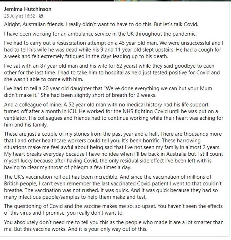 In the viral post Jemima Hutchinson, daughter of MIX FM breakfast host Caroline Hutchinson, pleads with Aussies to get vaccinated after witnessing firsthand how bad the pandemic can get.