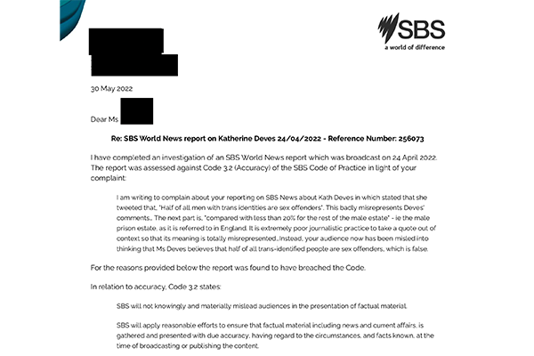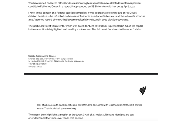 SBS apologises for misleading audiences over Katherine Deves