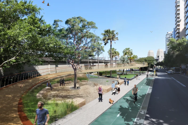 On the northern end of the bridge, where cyclists currently have to dismount and traverse stairs on foot, the ramp will connect to Alfred Street in Milsons Point.